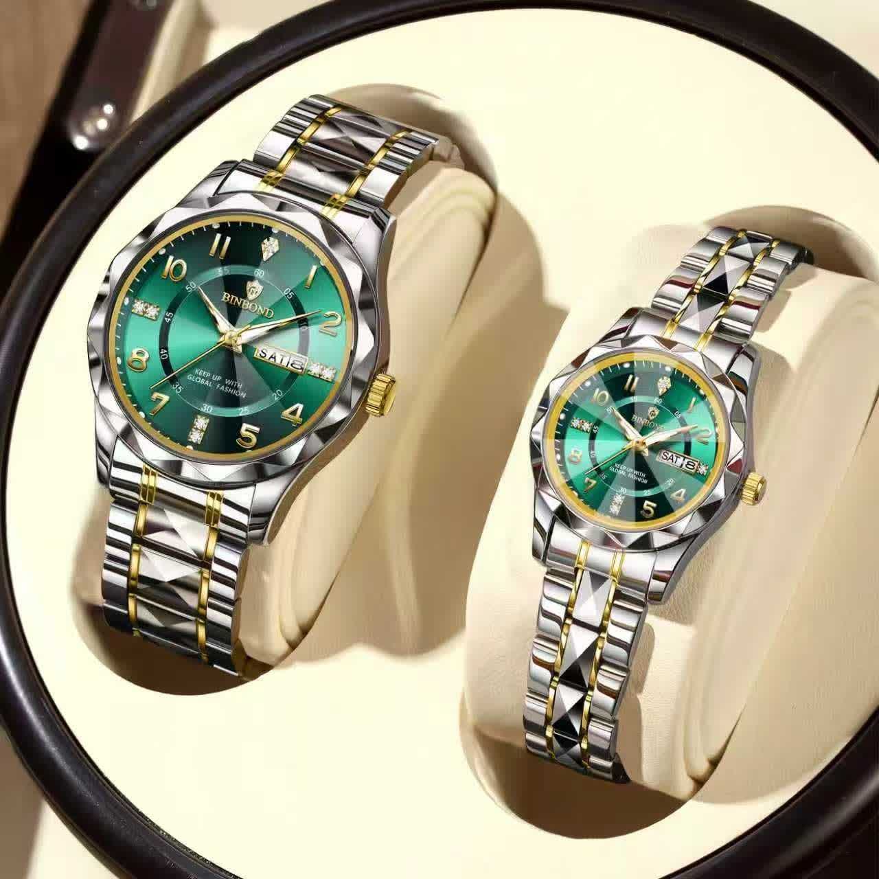 ست ساعت زنانه و مردانه ☑️BIN BOND 《highe quality》 Original watch ⌚️بین باند مدلی نو ست زنونه مردونه پرطرفدار مقاوم دربرابر آب برندشرکتی اوریجینال شب نما دارای روز شمار ایام هفته بند استیل فولاد شیشه الماسی قفل دو پروانه موتور کوارتز