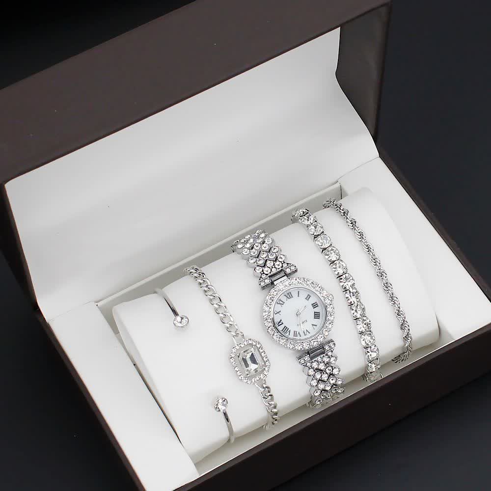 ست ساعت مچی زنانه نگیندار🤩 ➕همراه دستبند، گردنبند، انگشتر، گوشواره رنگبندی: نقرهای، طلایی، رزگلد کد محصول:472